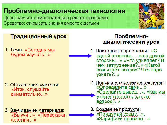 Проблемно-диалогическая технология дает развернутый ответ на вопрос, как учить, чтобы ученики ставили и решали проблемы. В словосочетании «проблемный диалог» первое слово означает, что на уроке изучения нового материала должны быть проработаны два звена: постановка учебной проблемы и поиск ее решения.