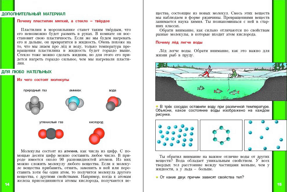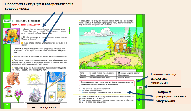 В начале темы помещены специальные вопросы по актуализации знаний, необходимые для изучения нового материала, а также размещен диалог детей, в котором создается проблемная ситуация. За ними следует авторский вариант проблемного вопроса, который показывает направление диалога учителя с учениками на этапе формулировки проблемы и дает возможность ученикам сопоставить свой ответ с версией авторов. Основная часть материала темы (текст, иллюстрации и задания) поделена на рубрики для облегчения восприятия темы и обучения составлению плана. Рисунки, как правило, снабжены заданиями, ориентирующими учеников на восприятие информации, содержащейся в иллюстрациях. В каждой теме четко выделена главная мысль и базовые правила, которые необходимо знать, помещены важнейшие понятия. Вопросы и задания в учебнике и в рабочей тетради позволяют оценить эффективность усвоения изученного материала и обучить школьников применению новых знаний.