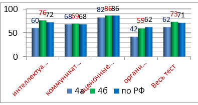 В 4б классе учащиеся показывают результат по интеллектуальным, коммуникативным показателям выше всероссийского, оценочные умения на одном уровне и средний балл по всему тесту выше общероссийского на 2%.