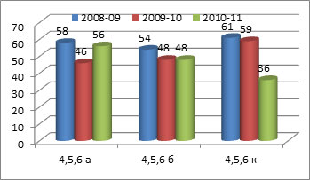 Сравнительный анализ по четвертям в течение 3-х учебных лет показал небольшое снижение качества знаний в 5 «А» классе на втором году эксперимента на 12% и снижение на 6% качества знаний в 5 «Б» классе, что связано с адаптационным периодом учащихся и объективными причинами, связанными с заменой педагога. На третьем году эксперимента качество знаний в 6а классе выросло до уровня показателя 4 класса, в 6б классе осталось на прежнем уровне.