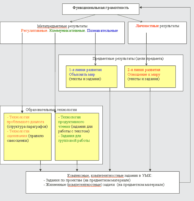 Все результаты (цели) освоения учебно-методического курса образуют целостную систему вместе с предметными средствами. Их взаимосвязь можно увидеть на схеме.